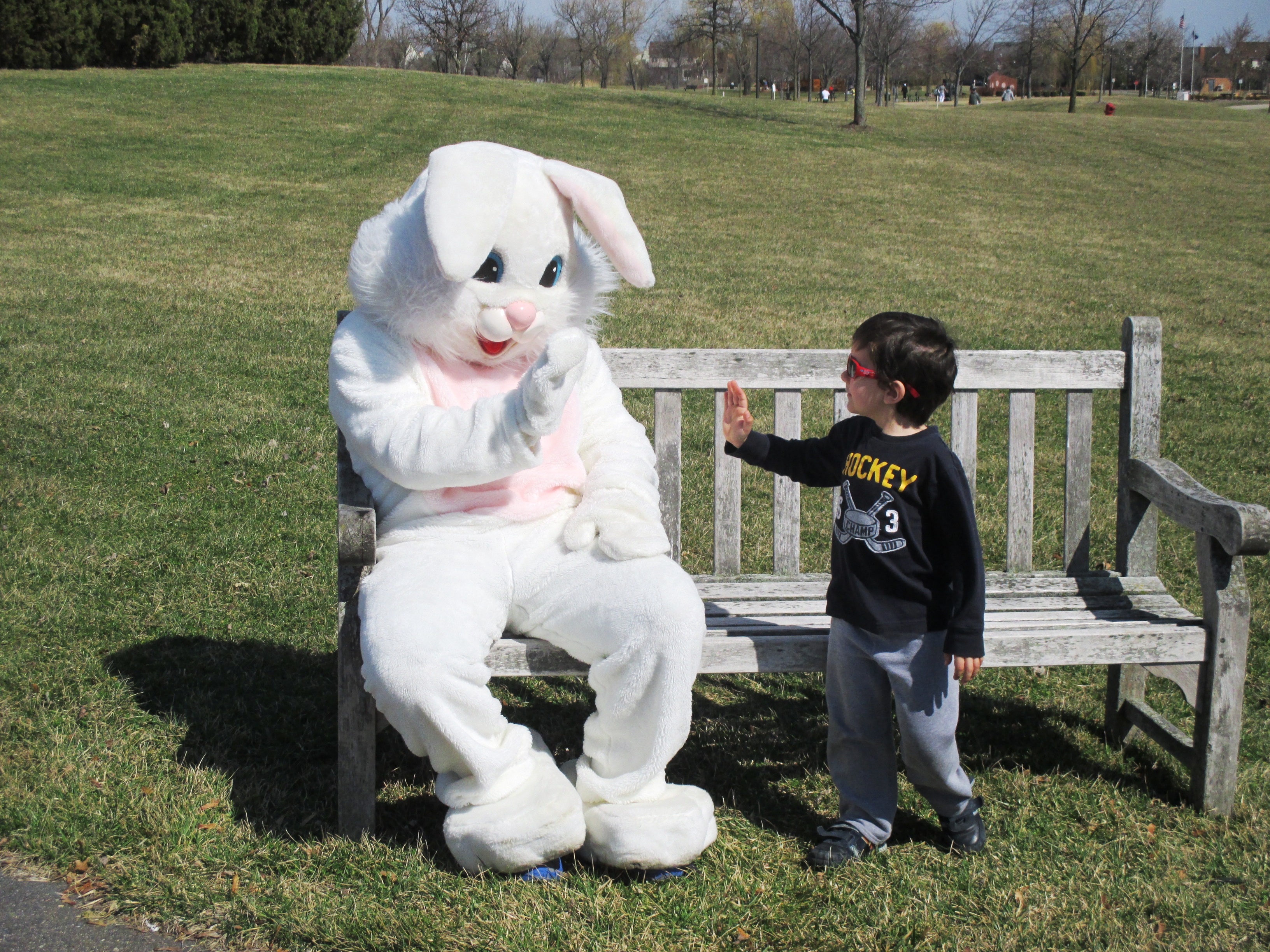 Outra coisa que, para quem tem filhos, eu achei muito legal aqui foram as “Egg Hunts” ou caça aos ovos para as crianças. Fomos em uma aqui no parque que tem próximo da nossa casa no final de semana passado. A brincadeira consiste basicamente em sair correndo com uma cestinha pelo parque e pegar o maior número de ovinhos que conseguir. Nesta em que eu fui, os ovinhos (de plástico colorido) estavam espalhados por uma área delimitada do parque e as criancas foram separadas por idade (maiores e menores de cinco anos), depois de encher as cestas, elas trocavam os ovinhos de plástico por uma sacolinha com adesivos (aqui os famosos “stikers”), bolinhas de sabão e pirulitos. Em outras “egg hunts” dentro dos ovinhos havia anéis de brinquedos, borrachas e adesivos. Acho que eles não colocam chocolate dentro dos ovinhos aqui por que existe uma precupação enorme com as crianças que são alérgicas aos “nuts”(amendoim, castanhas e afins). Fizemos uma Egg Hunt no nosso churrasco brasileiro de Páscoa e colocamos chocolates sem “nuts” nos ovinhos, e as crianças se divertiram muito claro!