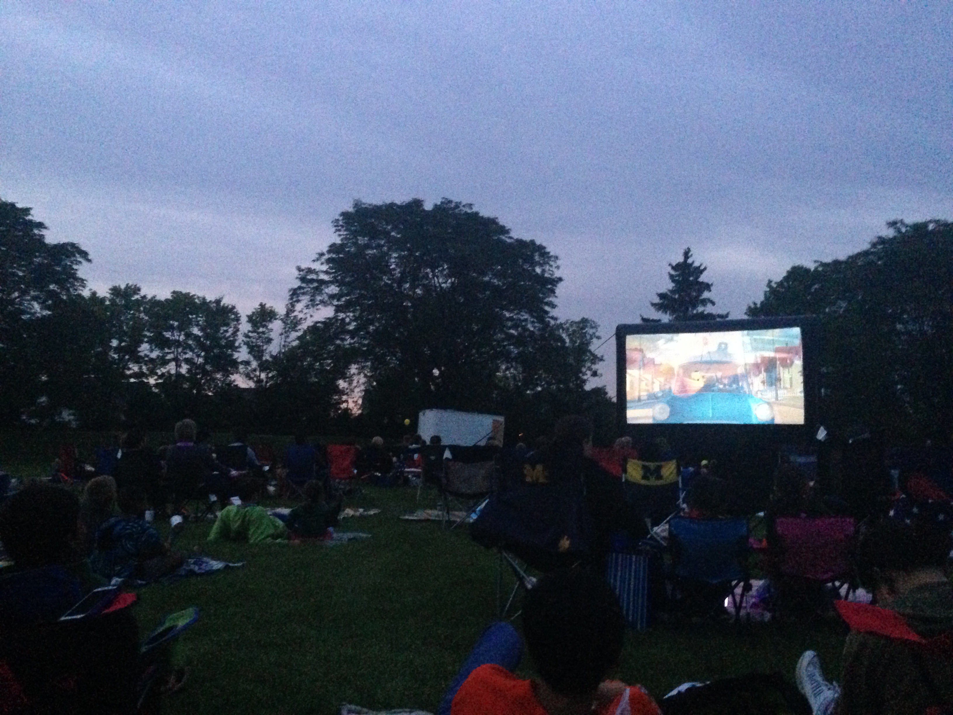 Neste mesmo parque, tivemos o cinema ao ar livre. Foi montado um telão no parque e por volta das nove e meia da noite (quando começa a escurecer por aqui) começou o filme “Meu malvado favorito 2”. Foi um programa bem família e da mesma maneira das noites musicais, as pessoas trouxeram suas cadeiras e edredons para curtir este momento no parque. Antes do filme começar tinha pula-pula inflável para as crianças brincarem, pintura facial e venda de limonada. Na hora do filme todos prestaram atenção e respeitaram o espaço dos demais.