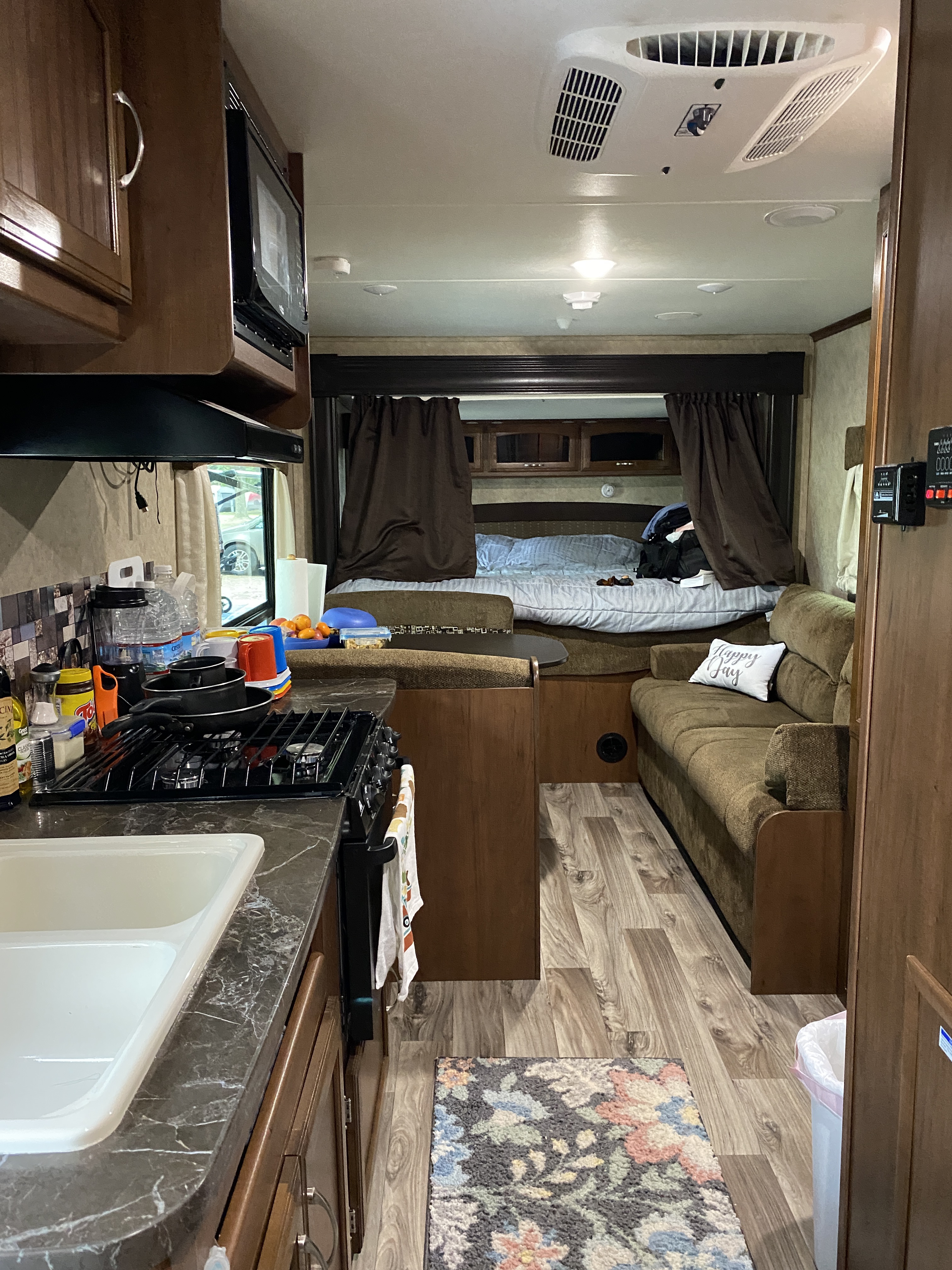 Acabamos locando o nosso pelo RV share e a experiência foi ótima. O trailer tinha 25 pés de comprimento e estava em ótimas condições, limpo, com todos os acessórios incluídos como utensílios de cozinha, cadeiras de camping, tapete externo e tudo mais. O trailer que locamos tinha beliche para os meninos e uma cama tamanho king (que ficava na parte de traz do trailer que expandia), cozinha, banheiro e um sofá (que virava uma outra cama). A cozinha era equipada com fogão a gás com 3 bocas, forno, microondas e geladeira com freezer. O trailer tem sistema de aquecimento a gás e elétrico.