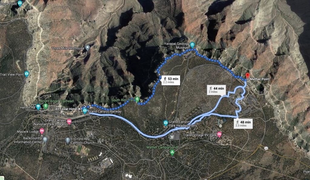 Fizemos o “The Rim Trail”, que é a trilha mais fácil e que dá para fazer com crianças tranquilamente, inclusive com o carrinho. Deixamos o nosso RV no estacionamento do visitor center e fizemos o trecho da trilha que vai do Mather point até a Vila margeando toda a borda do canyon. Fizemos este trecho sem pressa, parando praticamente em todos os mirantes e com pausas para lanchinho que tínhamos na mochila. No caminho tinham placas explicativas sobre a formação e a história do Grand Canyon e um museu geológico. Levamos aproximadamente 3 horas para fazer este trajeto.