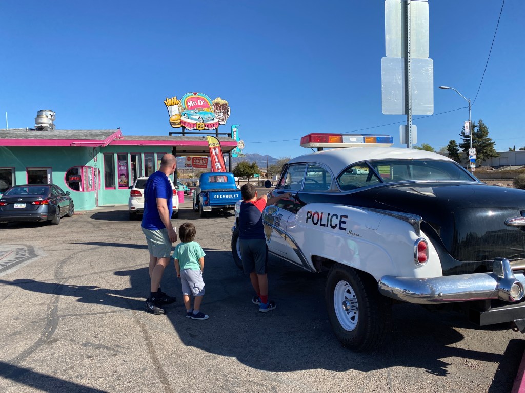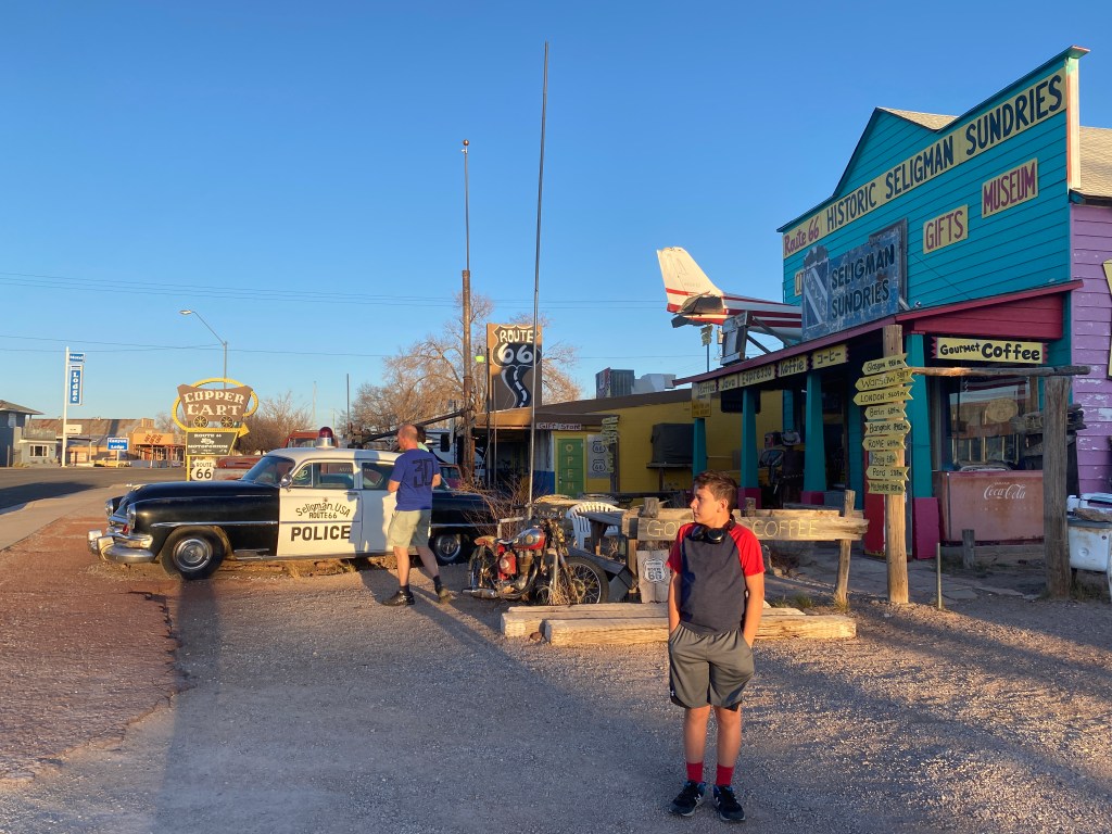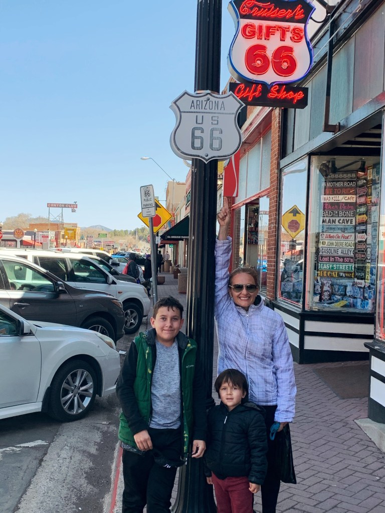 Fizemos o trecho da rota 66 que passa por Kingman, Peach Springs, Seligman e Williams. São cidades bem pequenas de beira da estrada (tipo piscou passou) onde tudo remete a famosa estrada inaugurada em 1929, que hoje é considerada uma estrada história aqui nos Estados Unidos, que ligava a cidade de Chicago no estado de Illinois à Santa Monica na California. Lanchonetes que remetem à década de 50, postos de gasolina, motéis antigos e gift stores fazem parte deste trajeto.