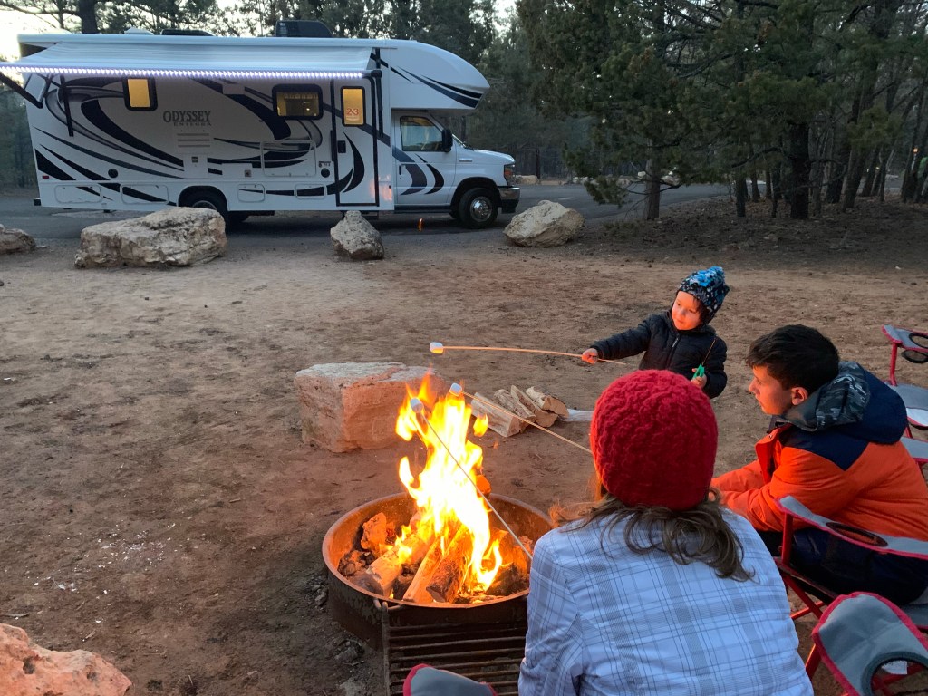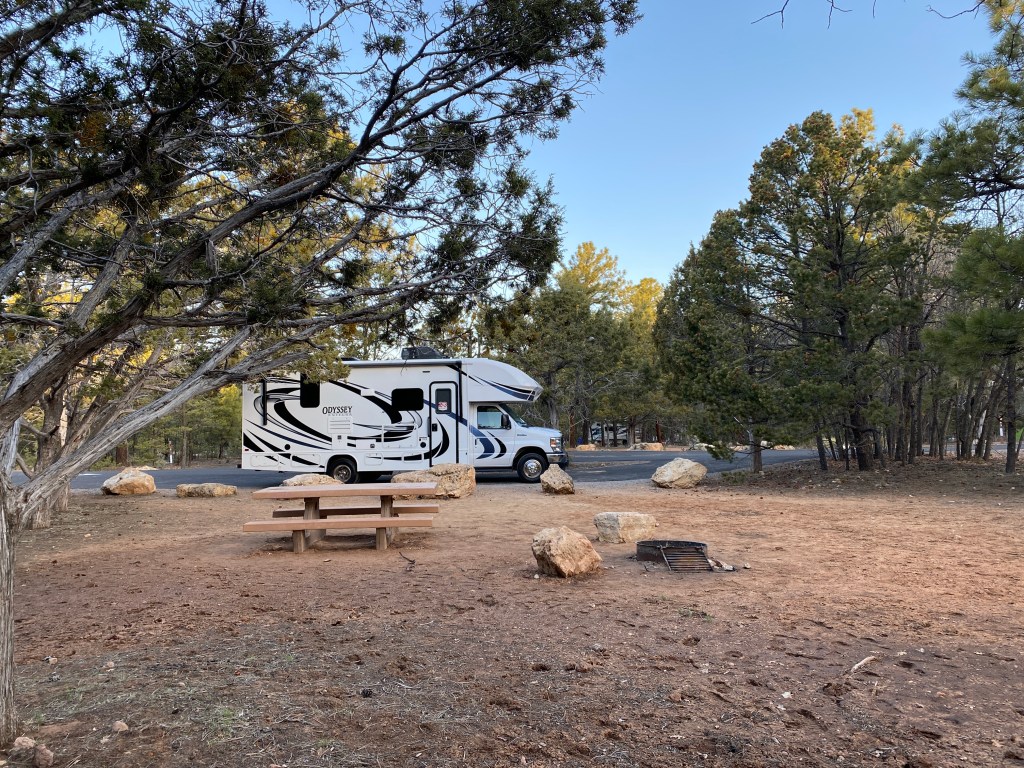 Quando reservei o camping no Grand Canyon, eu sabia que os sites no Mather campground eram considerados rústicos, isto é, não tinham ponto de energia elétrica, de água e esgoto no site. Mas como o RV tinha gerador, estávamos tranquilos com relação ao uso do chuveiro, aquecedor e fogão os quais poderiam ser usados no modo elétrico ou á gás. Porém não me atentei as restrições com relação ao horário para poder usar o gerador do RV no camping.