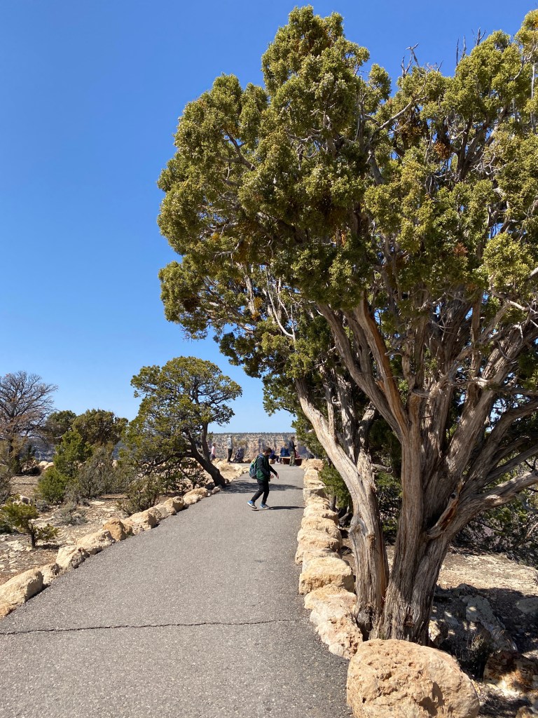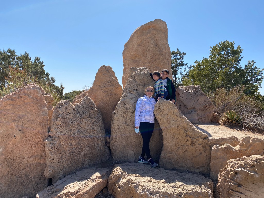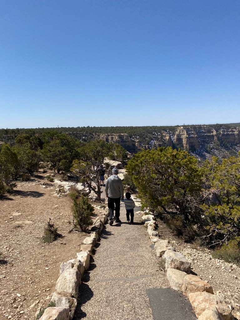 A idéia inicial era voltar de ônibus da Vila para o vistor center, onde estava estacionado o nosso motorhome, porém devido às restrições do COVID os ônibus que circulam pelo parque não estavam funcionando neste trecho (apenas a linha vermelha que vai para o Hopi Point e Hermit Rest estava em funcionamento no dia em que estávamos lá), então tivemos que refazer todo o caminho de volta a pé mesmo. Dessa vez, sem as paradas nos mirantes, levamos aproximadamente 1 hora para fazer o percurso de volta. As crianças cansaram e nós também e este foi o segundo perrengue da viagem.