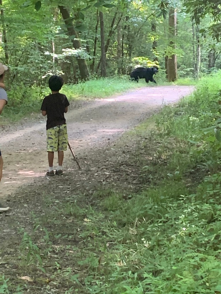 encontrar um urso e sim em chegar logo pois as crianças já estavam cansadas, um urso adulto cruzou a trilha poucos metros à nossa frente. Quando ele nos viu, deu uma paradinha no meio da trilha, olhou para nós (o coração disparou mais ainda) e seguiu para o meio da floresta.